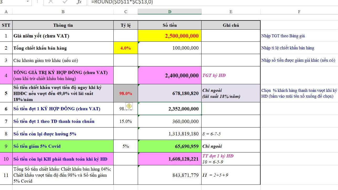 - sau 36 tháng nhận nhà giá hợp đồng cũ : 2.500.000.000 ( lợi nhuận 800.000.000 )