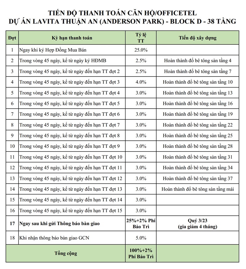 + Chiết khấu 18%/ ngày vượt cho khách hàng thanh toán vượt tiến độ.