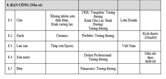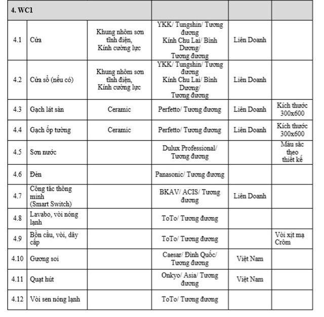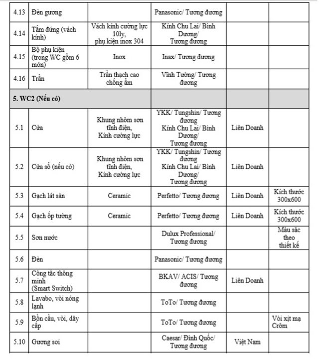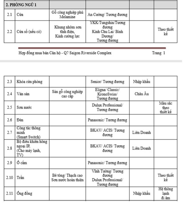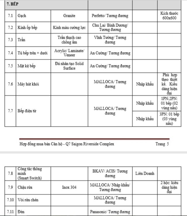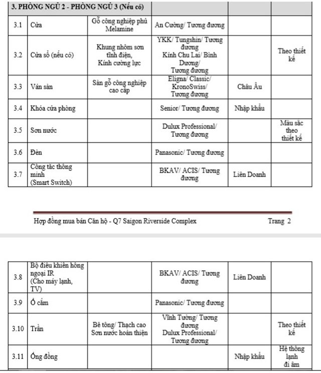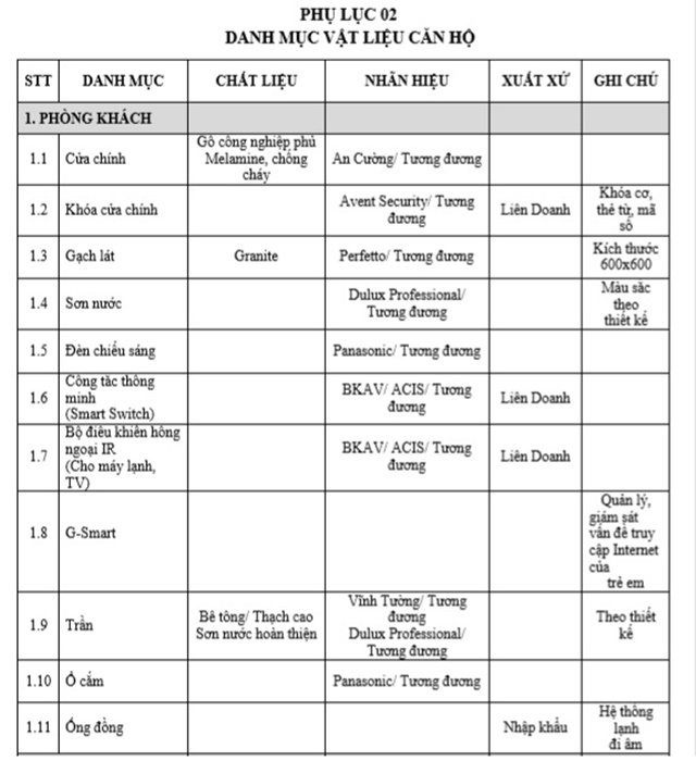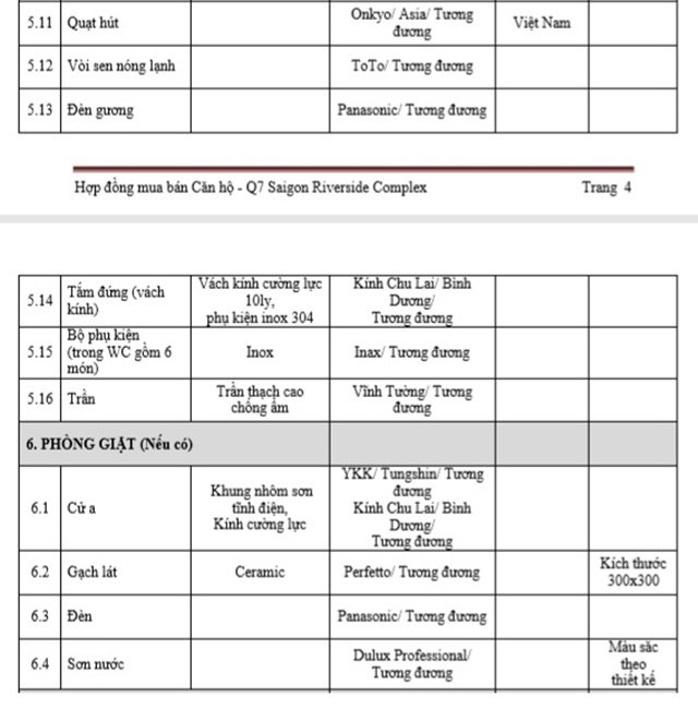 Chúng ta cùng xem qua bảng danh mục vật liệu căn hộ Q7 Saigon Riverside Complex chủ đầu tư Hưng Thịnh cam kết bàn giao: