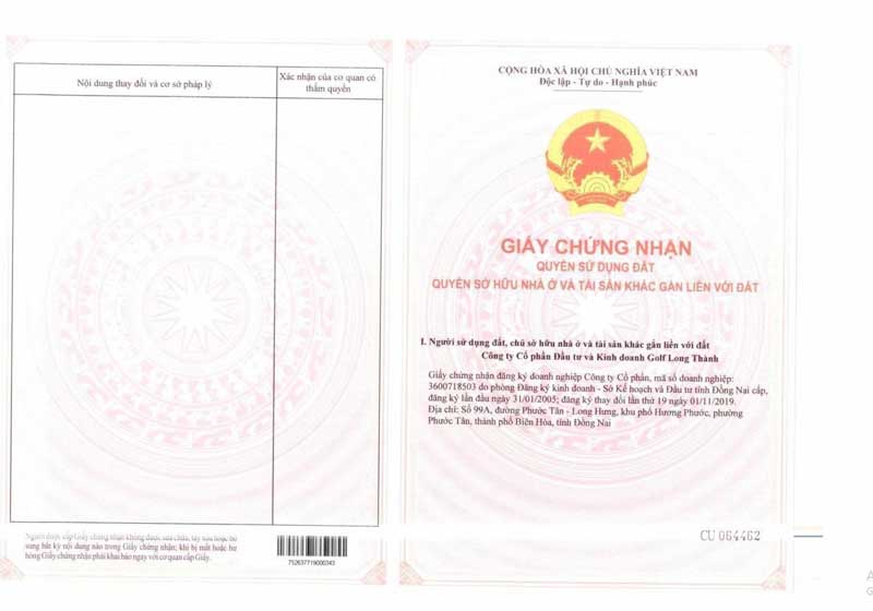 - Trang 1 gồm Quốc hiệu, Quốc huy và dòng chữ “Giấy chứng nhận quyền sử dụng đất, quyền sở hữu nhà ở và tài sản khác gắn liền với đất” in màu đỏ; mục “I. Tên người sử dụng đất, chủ sở hữu nhà ở và tài sản khác gắn liền với đất” và số phát hành Giấy chứng nhận (số seri) gồm 02 chữ cái tiếng Việt và 06 chữ số, được in màu đen; dấu nổi của Bộ Tài nguyên và Môi trường;