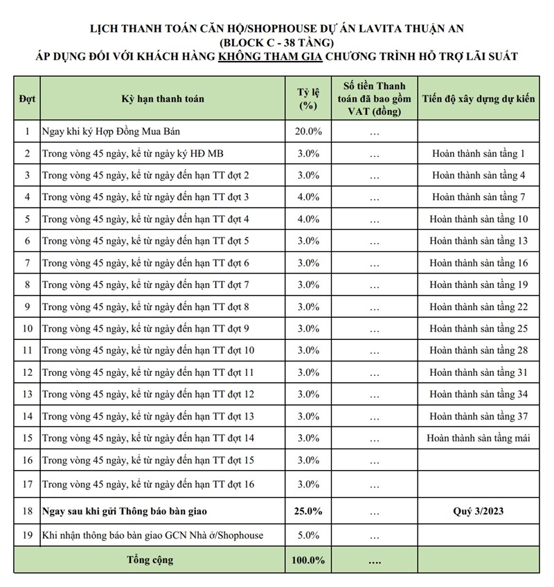 – Thời điểm bàn giao: Dự kiến Quý 2/ 2023.