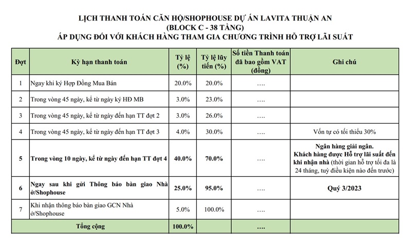 + Thanh toán: Ký hợp đồng mua bán 30% giá trị căn hộ chờ đến ngày nhận nhà.